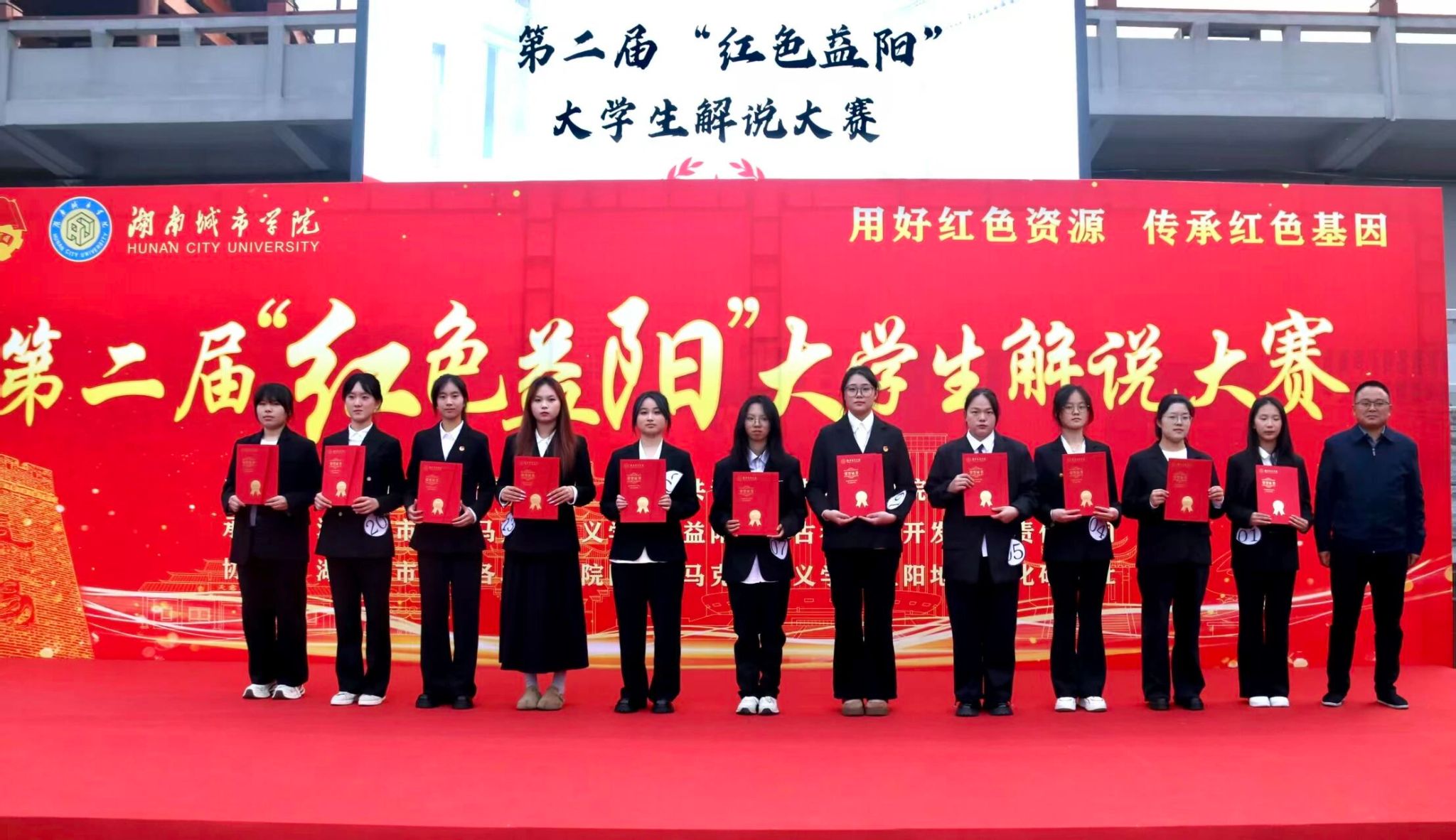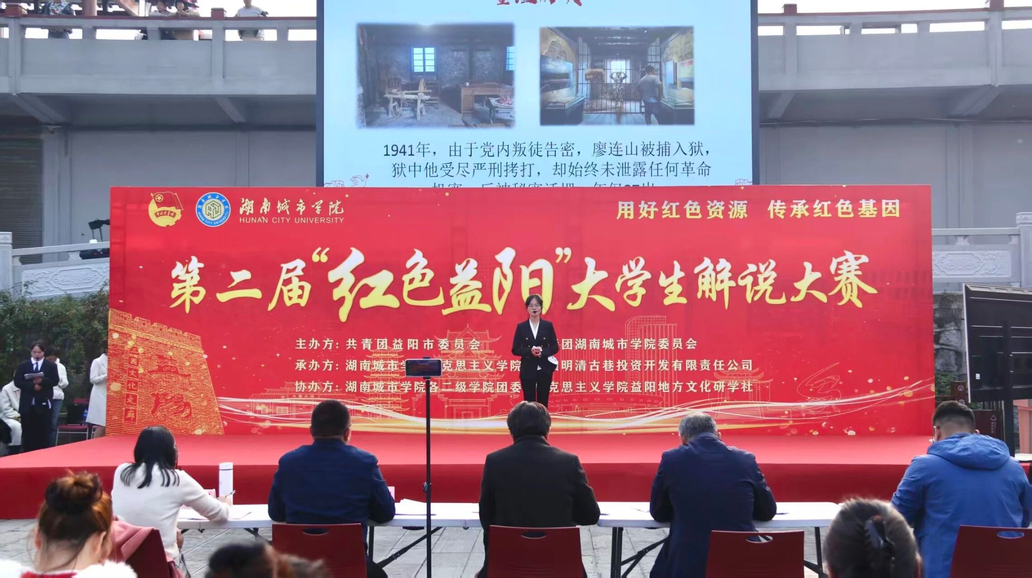 红色故事历久弥新,青春之声铿锵有力。为挖掘红色益阳的深厚底蕴,让红色基因融入青春血脉,让红色精神在城院代代相传,12月11日,湖南城市学院第二届“红色益阳”大学生解说大赛决赛在明清古巷顺利举行。本次大赛由继续教育学院党委书记谌金中,离退休处处长罗延富,共青团益阳市委副书记赵远帆,益阳明清古巷运营公司副总经理周云杰,湖南城市学院宣传部副部长周文娟共同担任评委。来自全校各年级的20支团队齐聚一堂,以青春之声深情讲述益阳这片热土上的红色故事,在语言的感染力与思想的碰撞中传递时代正能量,展现新时代青年传承红色基因、担当历史使命的精神风貌。
