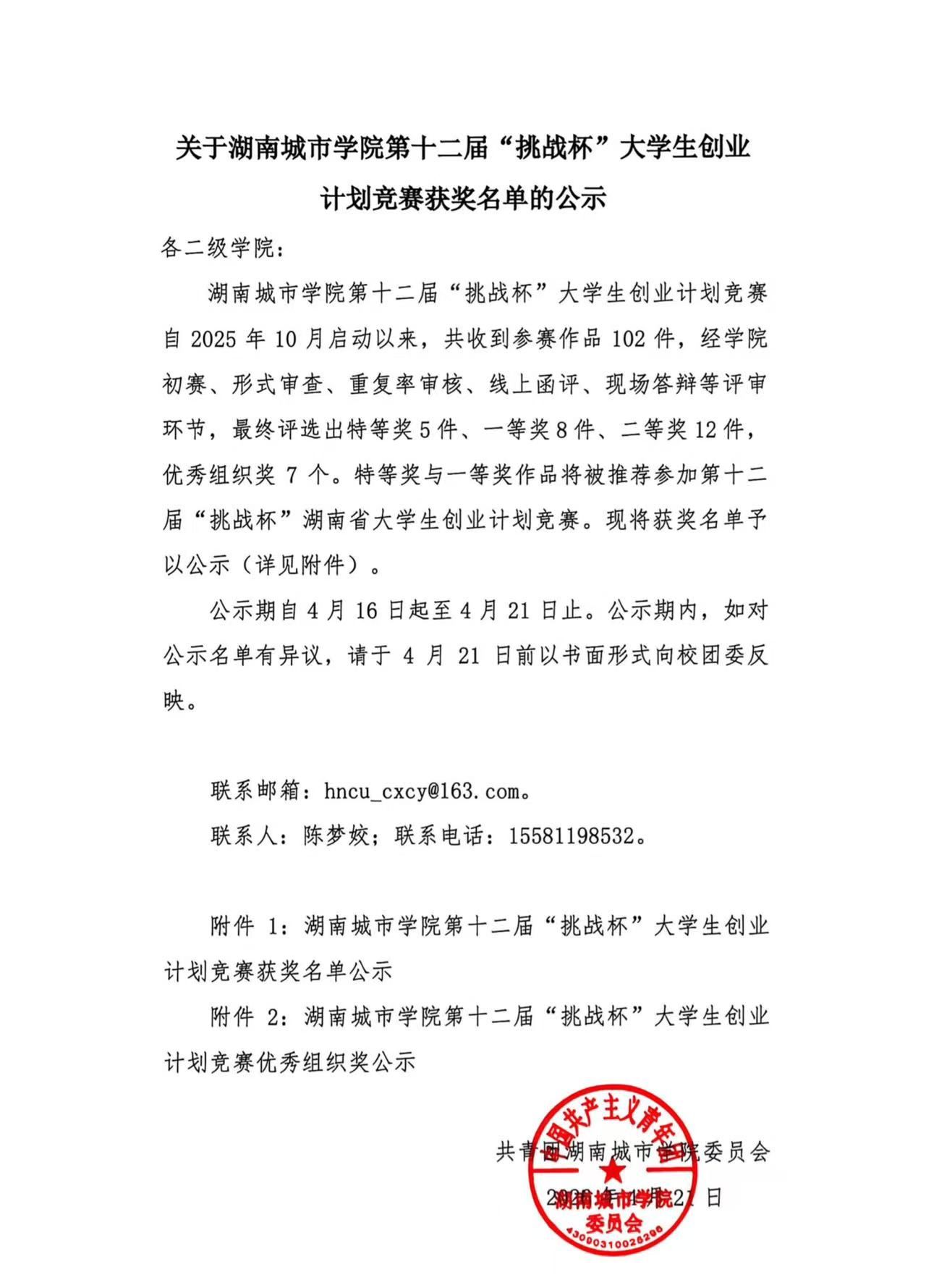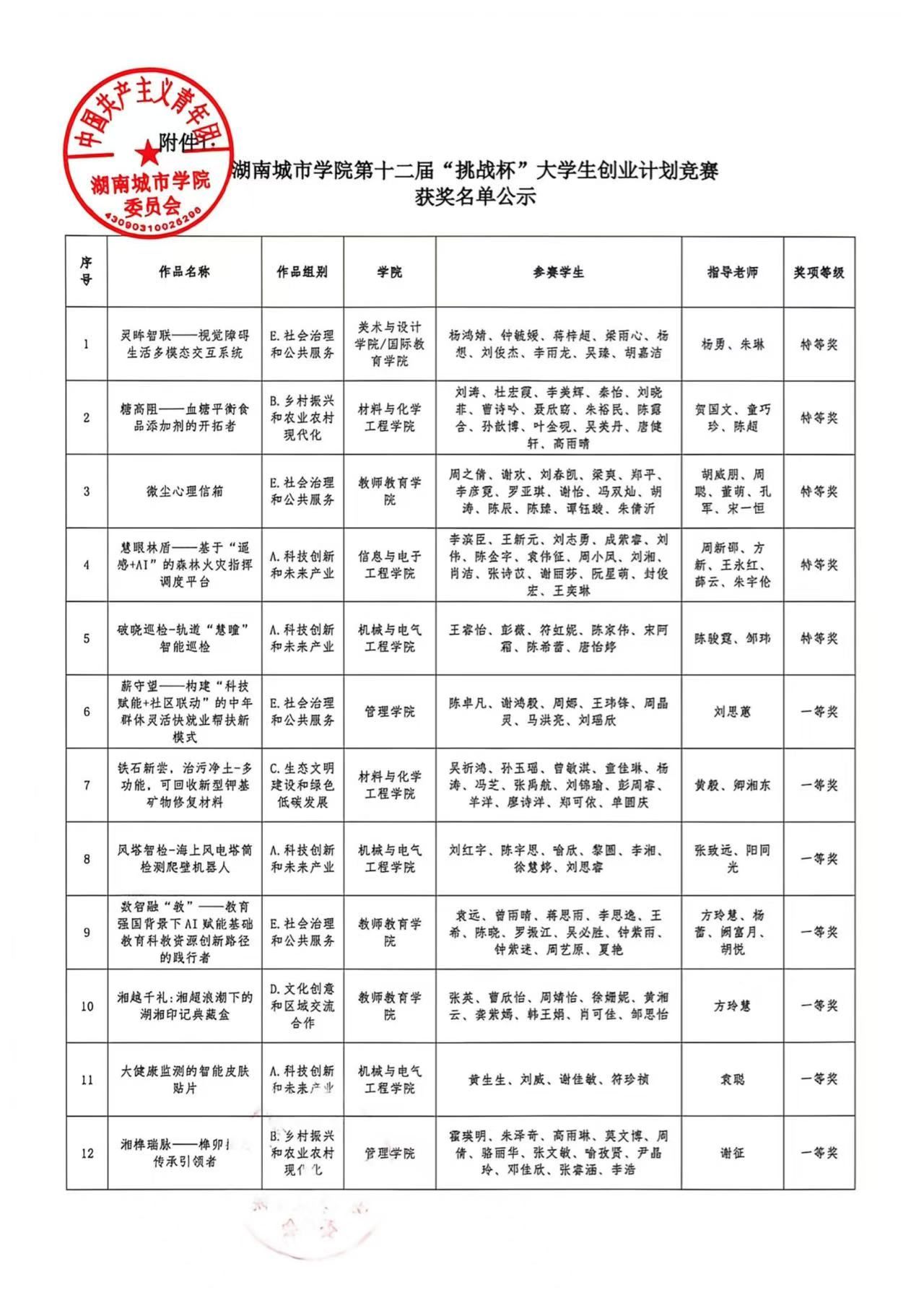 关于湖南城市学院第十二届“挑战杯”大学生创业 计划竞赛获奖名单的公示