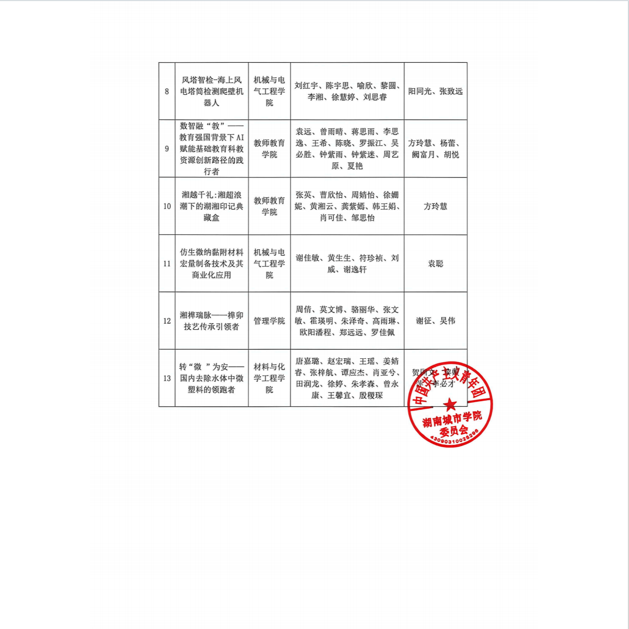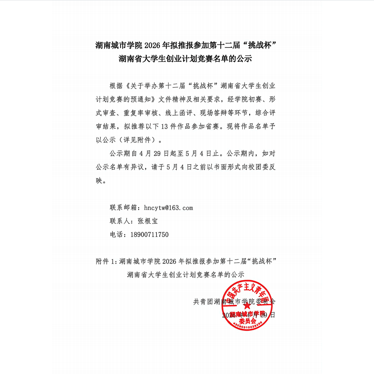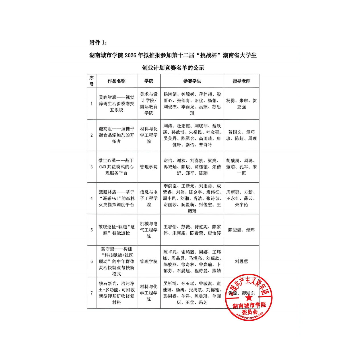 湖南城市学院2026年拟推报参加第十二届“挑战杯”湖南省大学生创业计划竞赛名单的公示