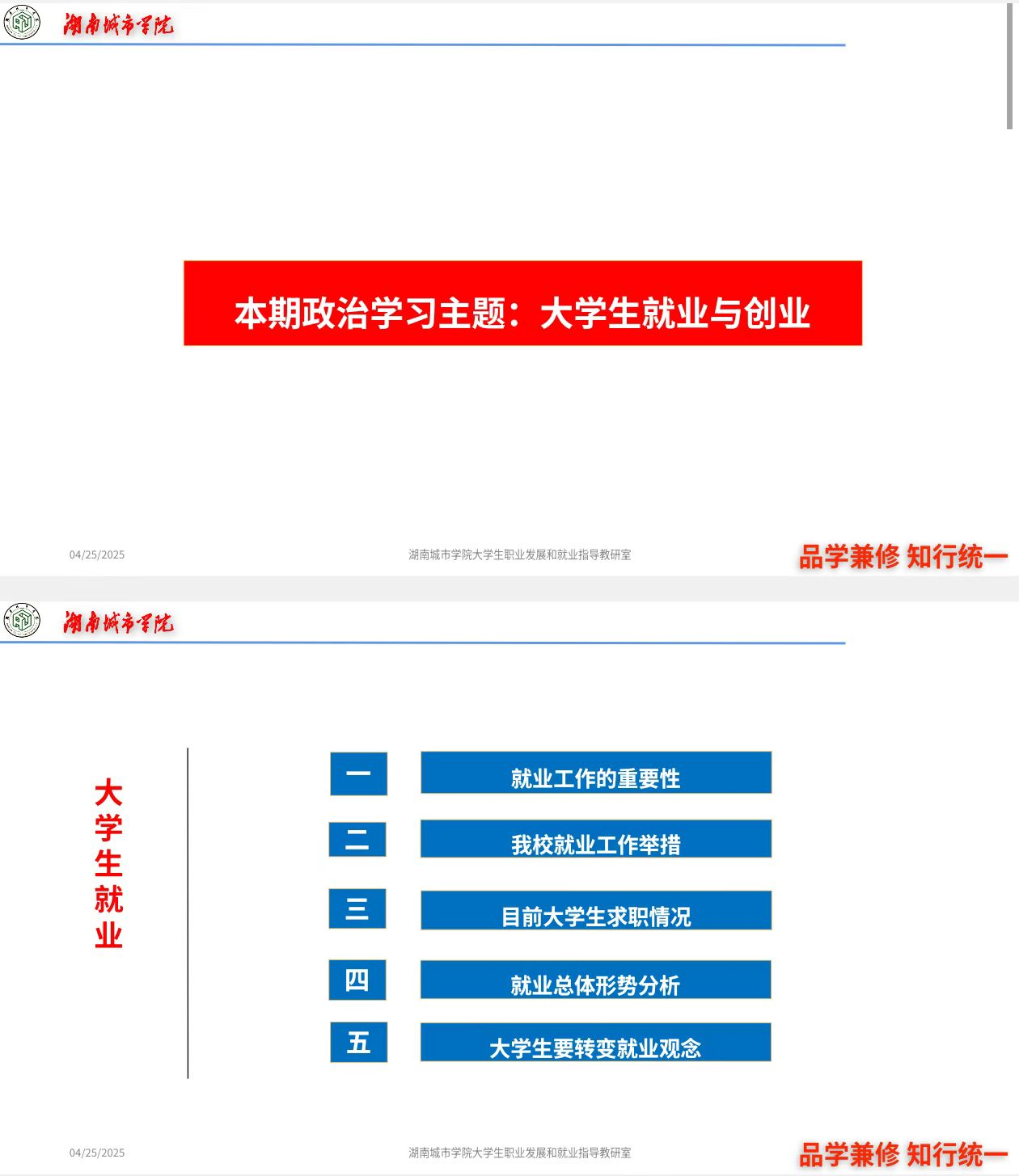 为深入学习贯彻习近平总书记 “ 两会精神 ” 中关于创新创业的相关理论,全面落实党中央、国务院对高校毕业生就业创业工作的决策部署,帮助城院学子更好地适应就业创业新形势,明确职业发展方向。2025年4月18日,我校各二级学院476个团支部围绕“ 大学生就业与创业 ”的主题,开展了本学期第二次政治学习。