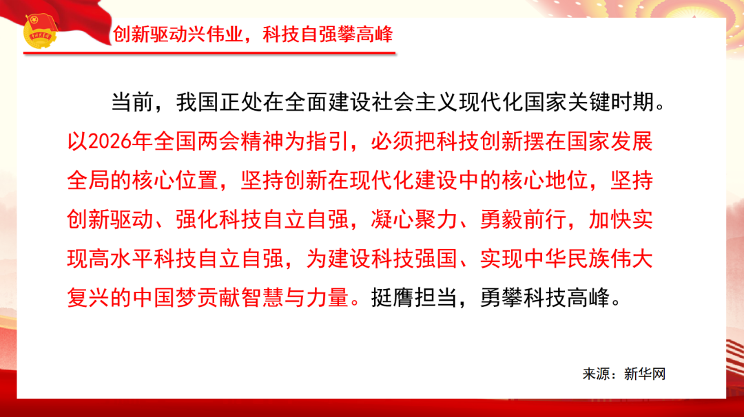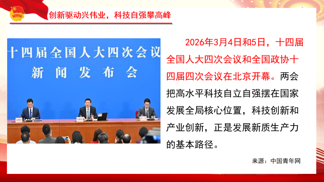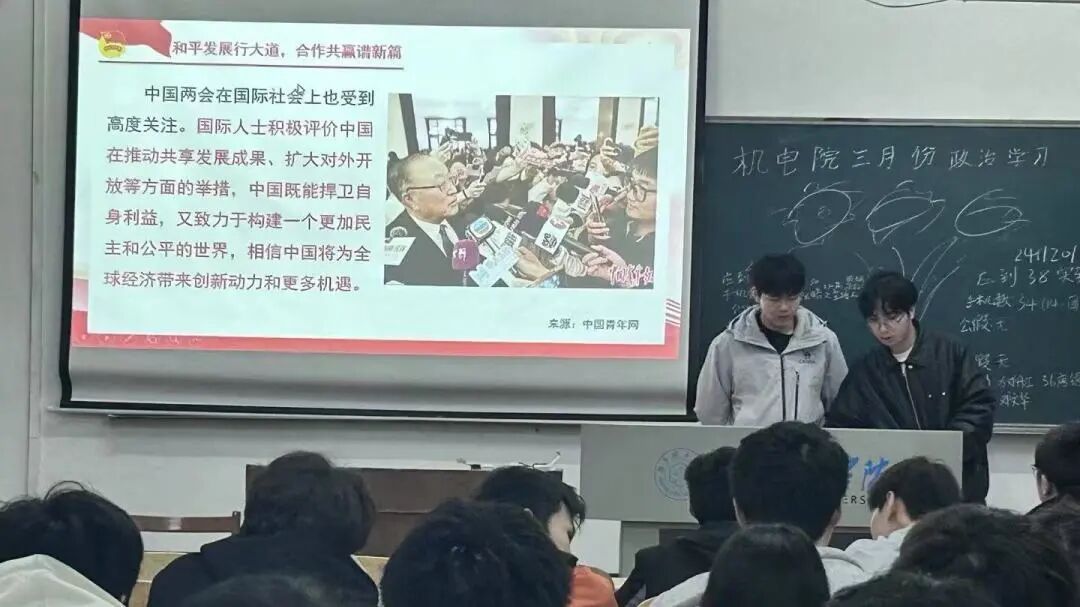 信息与电子工程学院2506901班团支部陈思雅同学在参加本次政治学习后感慨:“通过此次深入学习两会精神,我深刻领悟到科技自立自强是高质量发展的核心支撑,作为工科青年,我们应以两会精神为指引,将科技创新摆在国家发展的核心位置。未来,我将深耕专业知识,培育创新思维,积极投身科创实践,勇啃技术‘硬骨头’,努力为突破‘卡脖子’技术、发展新质生产力贡献青春智慧。”