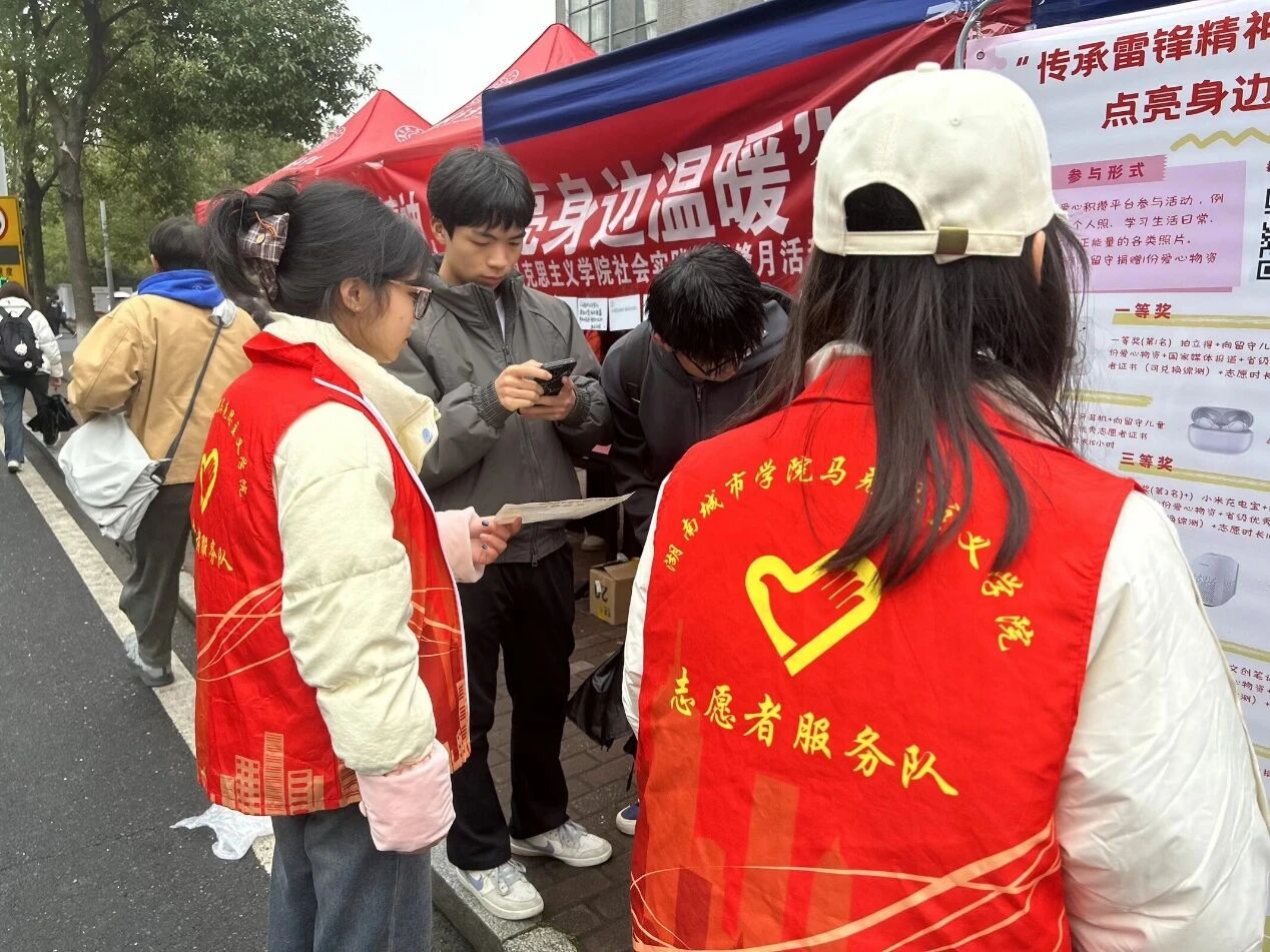 在互动体验环节,志愿者们准备了明信片,通过有奖问答环节,参与的同学不仅学习了与雷锋相关的科普知识,还收获了定制小礼品。活动现场,同学们纷纷提笔写下对雷锋精神的理解与感悟,将一张张承载真挚心意的纸条亲手粘贴在活动横幅上,让温暖的心声随横幅一同传递。